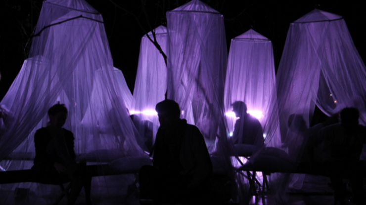 Grâce à un dispositif immersif original, les spectateurs sont plongés dans une ambiance propice à l’écoute. Des moustiquaires enveloppent les lits, entre le cocon et la cabane de notre enfance. La lumière est enveloppante, la musique envoûtante, rythmant le récit conté par un comédien dont on devine à peine la présence. Totalement immergé dans cette atmosphère invitant au lâcher-prise et au rêve, le spectateur quitte peu à peu la réalité et se laisse porter dans un fabuleux voyage au cœur de l’étrange et du merveilleux.