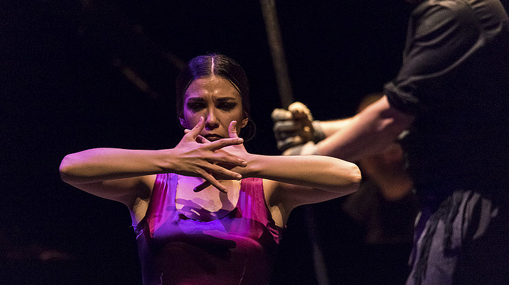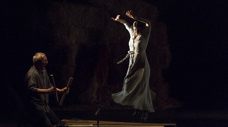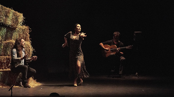 La danseuse Adriana Bilbao incarne cette détermination. Son flamenco s’envole au contact des chants basques et andalous de Beñat Achiary et Raúl Micó, sur les musiques de Guillermo Guillén et Michel Queuille et aux rythmes des percussions