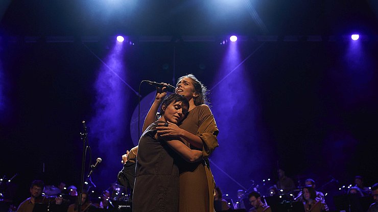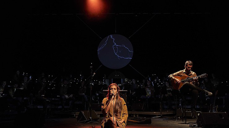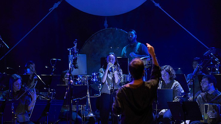 Composition, direction : Daniel López Pradas / Chant : Alba Armengou / Avec : Adrià Grandia Moreno, viole, tarota / Alba Careta Arnaus, trompette / Albert Dondarza Roca, Anna Urpí Baldrís, Apel·les Carod Requesens, violon / Cati Plana Cerdà, accordéon diatonique / Cristina Boixadera Ibern, basse / Darío Barroso Miranda, guitare / Elias Porter Marin, alto / Francina Mercadal Cavaller, trombone / Iu Boixader Castelar, contrebasse / Ivan Alcazo Castellarnau, tible / Ivó Jordà Álvarez, gralla, tarota / Joana Fugaroles Ferrer, alto / Joana Gumí Roca, violon / Jordi Montasell Bachs, fiscorn / Josep Cordobés Miravitlles, batterie / Manu Sabaté Benach, clarinette basse, tenora, gralla / Marc Vall Balañà, percussions / Marçal Ramon Castellà, accordéon diatonique / Maria Antònia Gili Cursach, trompette / Maria Puertas Malagarriga, tuba/ Martí Villegas Pons, fiscorn / Mireia Vila Cejudo, violon / Montse Soques Berga, flabiol / Núria Casas Coll, contrebasse / Pau Puig Olives, dolçaina, sac de gemecs / Pere Olivé Aymerich, percussions / Rosa M. Rodríguez Malé, tenora / Ballerine : Fàtima Campos Trepat / Direction artistique : Martí Torras Mayneris / Dramaturgie : Martí Torras Mayneris, Dani López Pradas / Régie son : Pau Vinyoles Romo / Masterisation : Ferran Conangla Mayor / Régie lumière : Bernat Tresserras Pi / Scénographie : Martí Torras Mayneris / Costumes : Miriam Ponsa / Assistant son et lumière : Abdon Compta Solano / Photographies, visuels : David Ruano / Photographies : Montse Capdevila Lorenzo / Conception graphique : Oriol Piferrer Saló / Audiovisuels : Marta Rodriguez Quesada, Joanot Cortès Fàbregas, Alejandro Ramírez Ariza (Comptagotes) / Vidéo : Artur Blasco Giné / Production : David Coll Bailador, Marçal Ramon Castellà / Communication : Ivó Jordà Álvarez