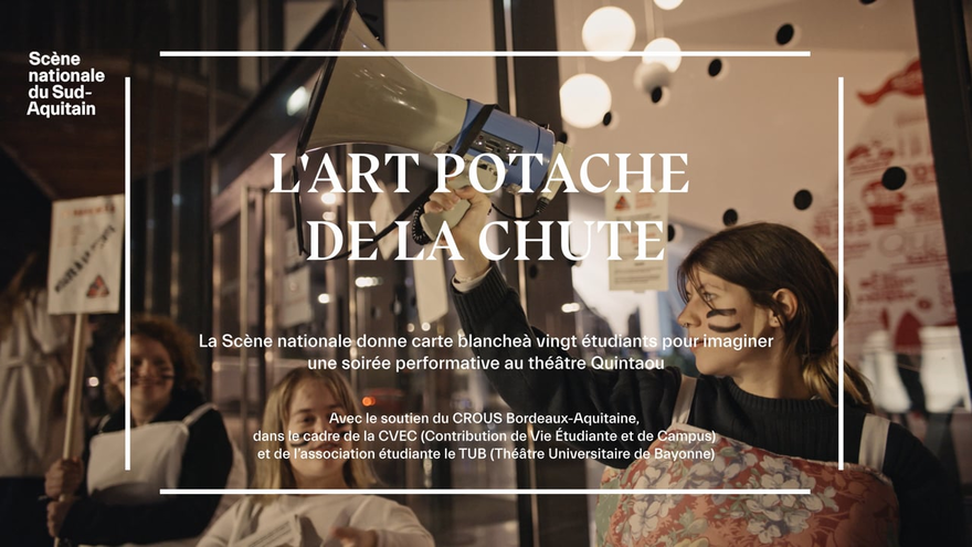 La Scène nationale donne carte blanche à vingt étudiants pour une soirée performative autour de L’Art potache de la chute. Cabaret, danse, concert, performance… guidés par des artistes de la saison, ces performeurs en herbe révéleront toute l’étendue de leur talent dans une création originale où tout peut arriver. Une belle aventure humaine, artistique et festive.