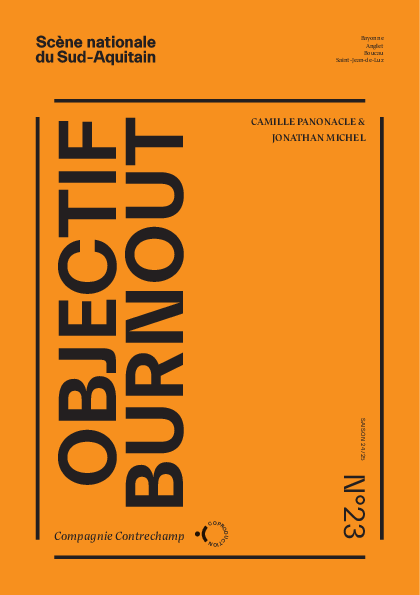 Comédie engagée et poétique, Objectif Burnout interroge un monde du travail tout près du pétage de plombs ! Après La Terre tremble en 2022, Camille Panonacle et Jonathan Michel ont conçu une pièce inspirée des écrits d'Alexandra Badea et Hannah Arendt. À partir d’extraits choisis, les deux artistes ont inventé une scénographie en compagnie de trois comédiens et deux musiciens dans un décor très années 70 aux allures de talk-show avec dispositif vidéo… Sommes-nous prêts à tout sacrifier et détruire au nom du travail ? Sommes-nous des consommateurs ou des citoyens ? En tout cas, venez tels que vous êtes pour découvrir cette création en état d’alerte !