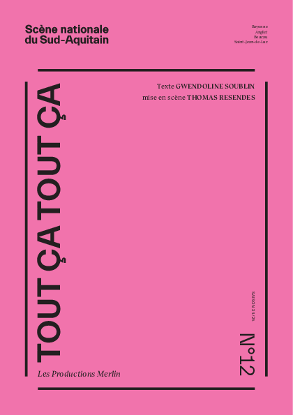 « Tout ça Tout ça est un texte que j’ai voulu très joyeux, parfois grave mais surtout plein d’espoir. La force du collectif est celle qui permet d’avancer et de lutter contre ce qui désenchante. À l’image du personnage d’Ehsan, j’ai souhaité écrire ce texte avec l’énergie de mes inquiétudes – parce que le monde, oui, est souvent désespérant mais pas foutu, non, pas encore foutu, tant qu’on veut bien croire en l’action et qu’on se permet de bien croire à l’action et qu’on se permet de rêver grand. » Gwendoline Soublin